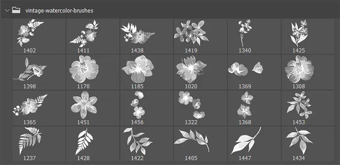 图像包括单花,花束,叶子和花瓣,你可以混合和匹配,以创造各种外观。下面是一个预览,其中包括一些复古水彩花刷。