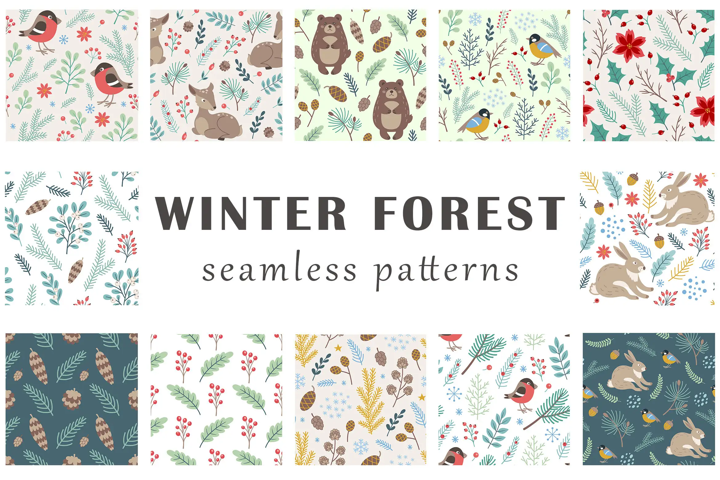 这是一套可爱的装饰性冬季森林矢量设计元素,包括动物和植物。这个套装包含16个不同的元素,16个无缝图案和16个现成的背景。您将获得: