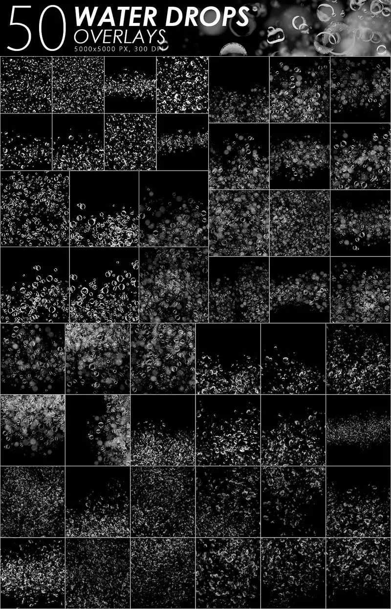 50个水滴覆盖层(5000x5000像素,300 dpi,Jpeg)