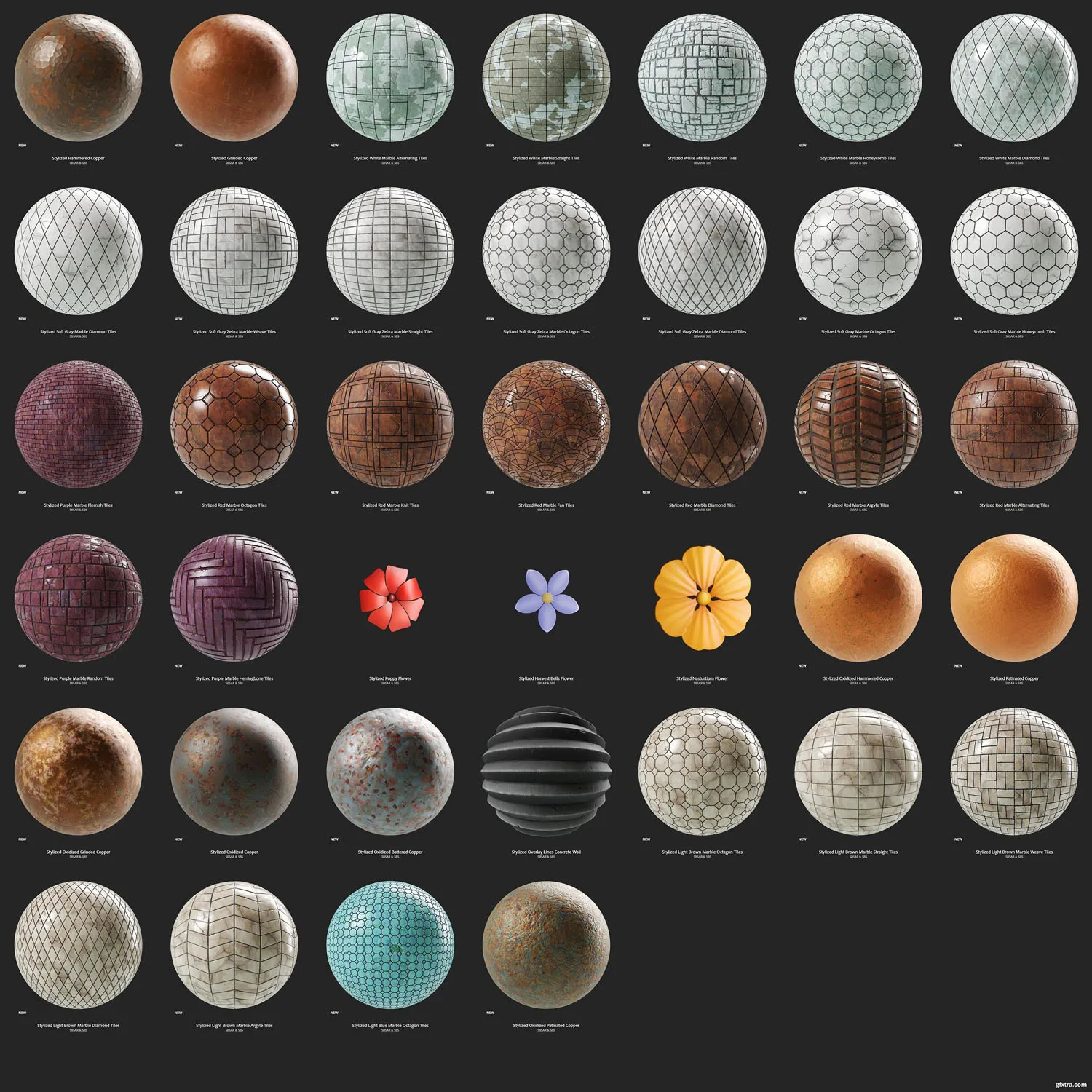 39个 Substance材质源文件,风格化的铜,金属,瓷砖,大理石,罂粟花,地砖等。sbs sbsar格式。