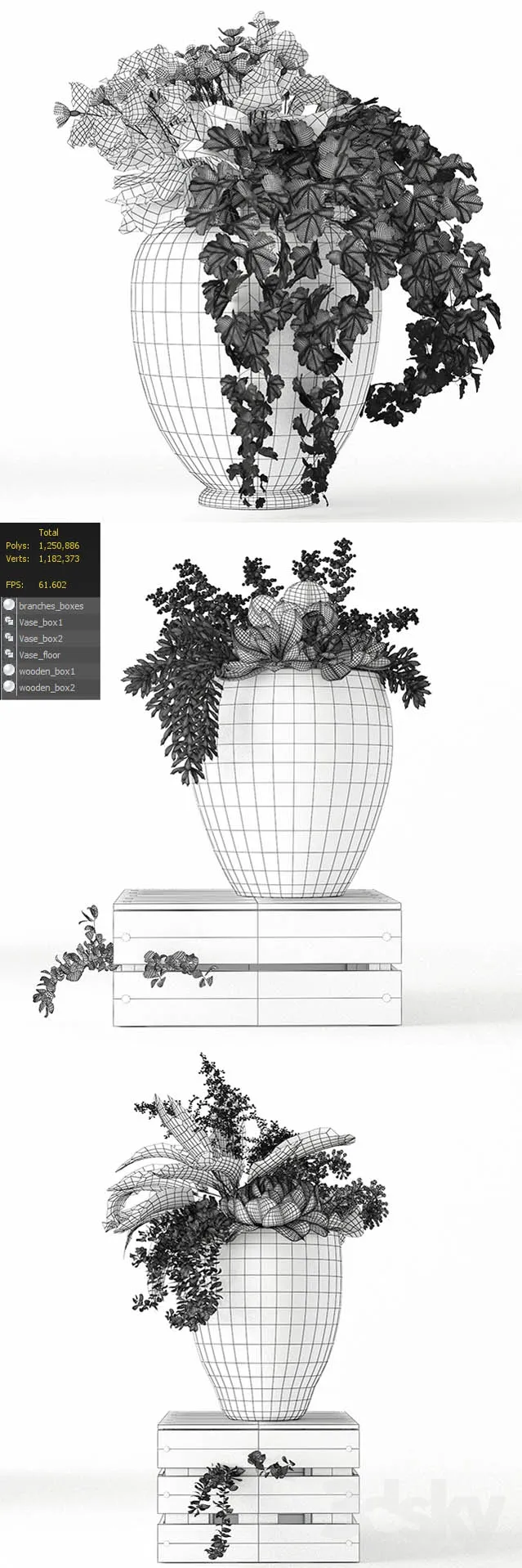 花盆足够高而且很重。适合装饰在窗户旁边或花园外面的门廊。对于每个装有植物的花盆,都为其分配了自己的MultiSubMetarial,对于盒子,也为其分配了自己的材料。材质Vray 2.5