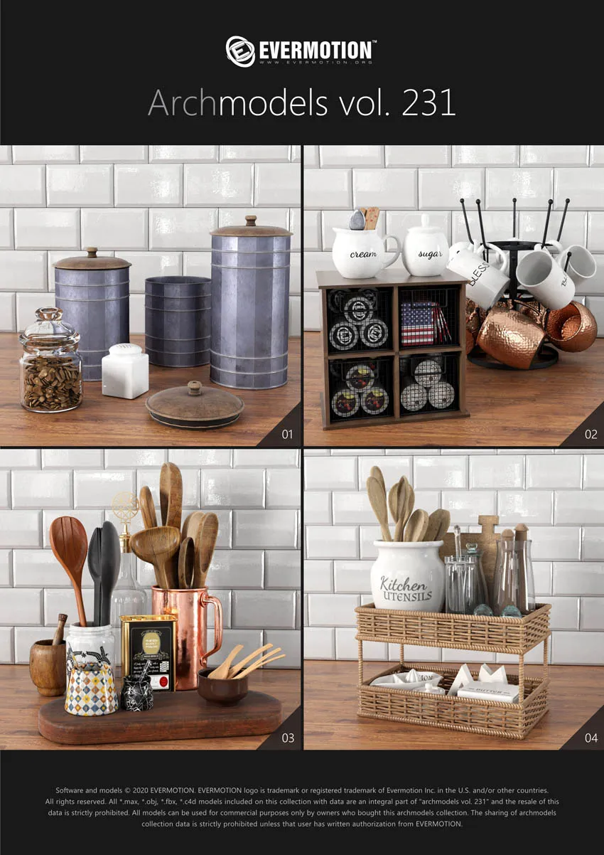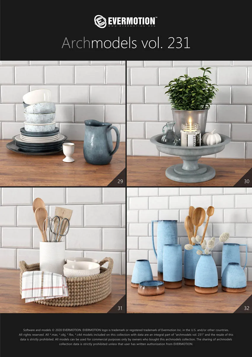 建筑模型卷 231为您提供了32个专业的,高度详细的对象,可用于建筑可视化。 该系列包括100多种型号,分为32套,可适合任何厨房内部空间(现代和复古)。 您会在这里找到厨房道具,例如餐具,瓷器,罐子,盒子等。所有对象都可以在可视化中使用。