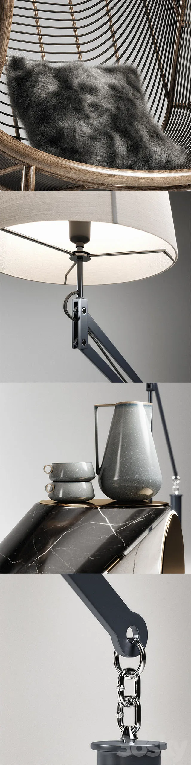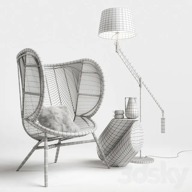这是带有 Ralph Pucci 复式落地灯的 Greige Design Olaf 椅子。 边桌是 Arne Jacobsen 设计的。 马克杯来自 Ferm Living Neu 系列。 枕头采用定制拉丝 VRayFur 制成。 所有模型的 turbosmooth 修改器仍然完好无损,以便轻松调整模型权重,并且在适用时,网格已被 UV 展开。