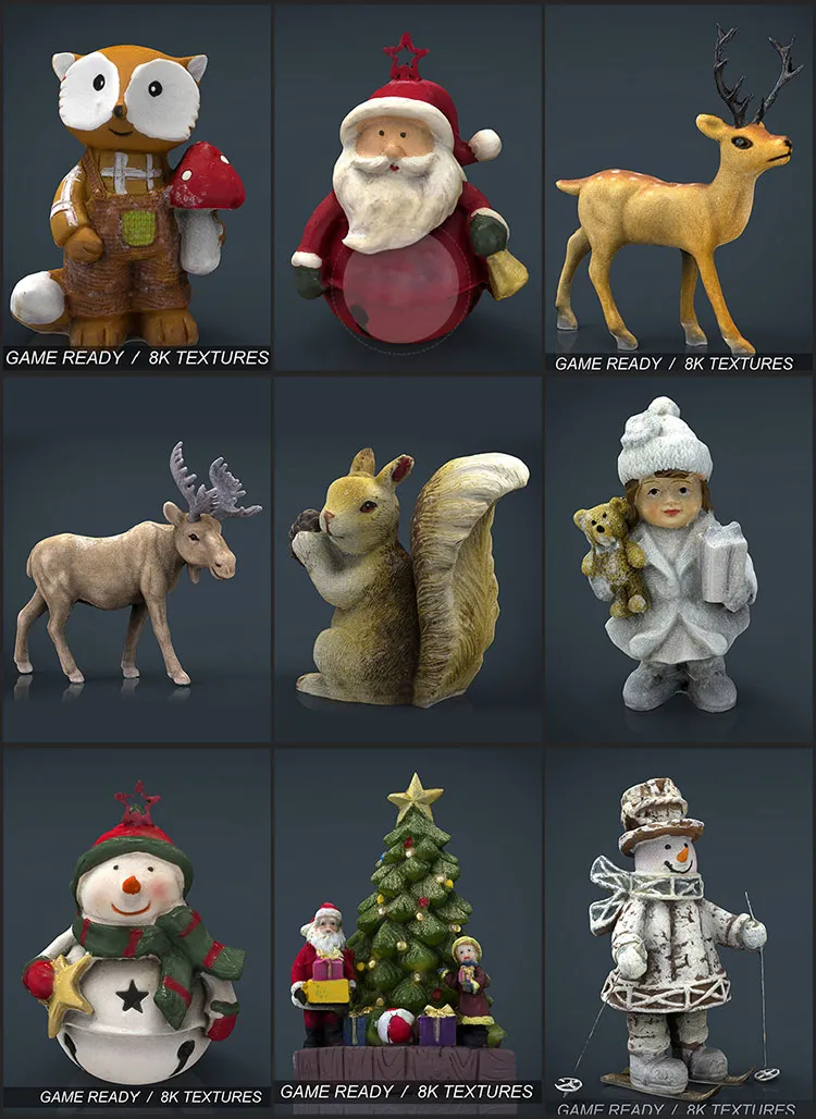 这是一套圣诞节的模型包,有圣诞老人、麋鹿、小松鼠、雪人、圣诞树、小浣熊、小孩、梅花鹿等9个模型,格式有max/fbx/obj/mb,含贴图材质 素材使用需要有一定的软件和设计基础