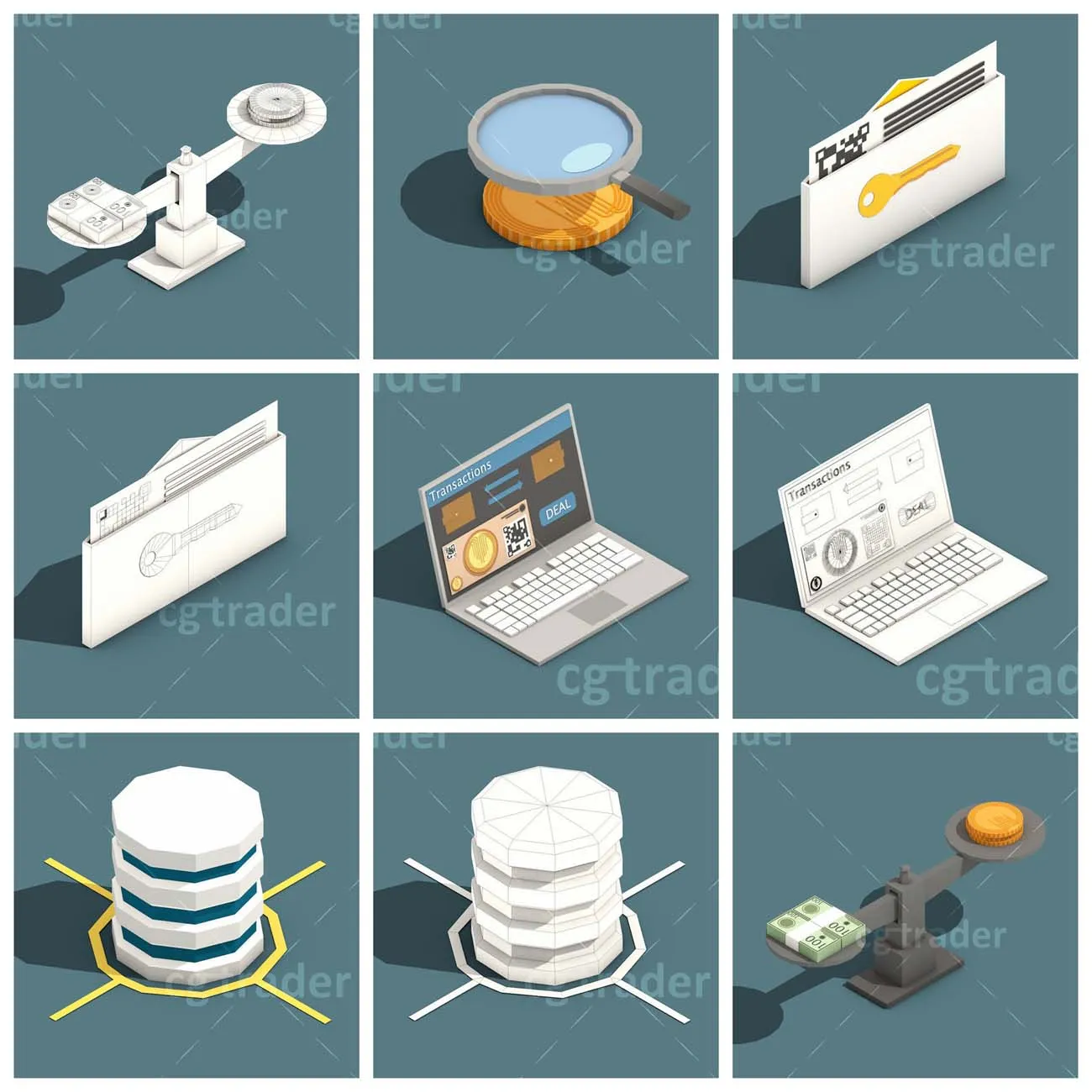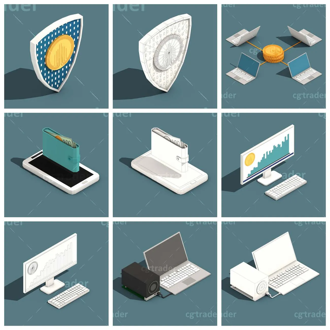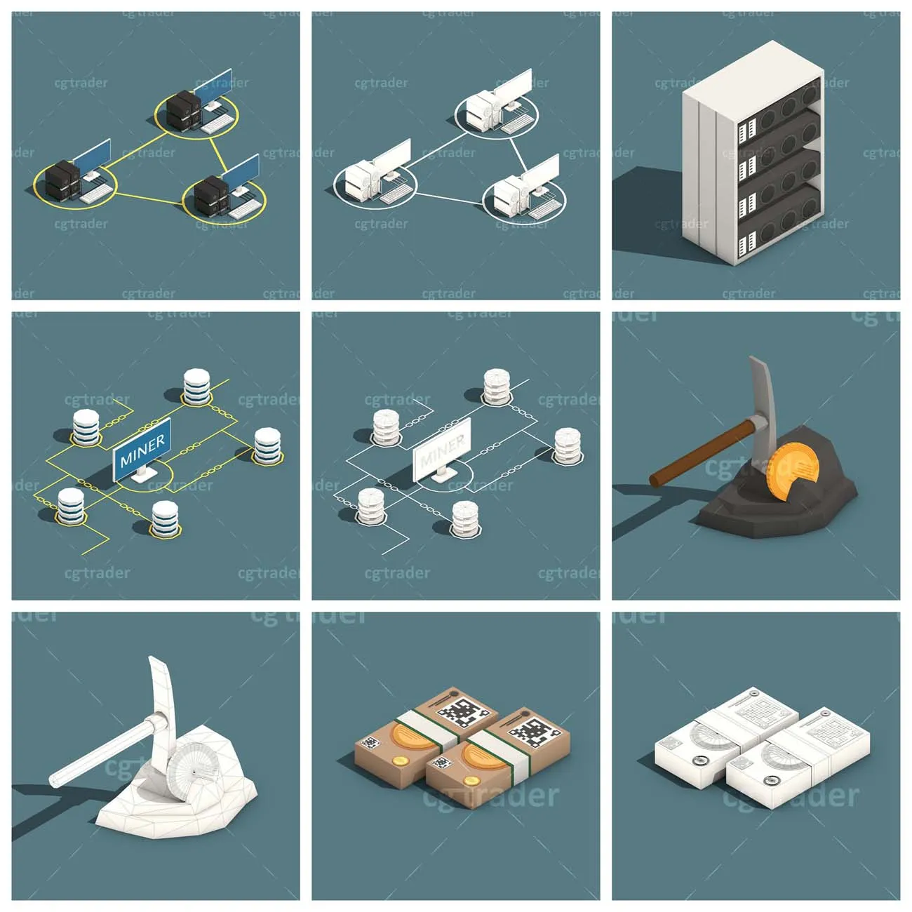 在Cinema 4D中渲染标准。纹理文件大小(2048 * 2048),您可以通过拖动紫外线轻松调整颜色。模型准备好游戏,渲染,制作视频,动态图形,inforgraphic,3d map ..等这个包包含:ASIC矿工,区块链图标,控制,加密货币,动态,交换率,关键代码,采矿,采矿农场,游泳池,安全,交易,钱包.....