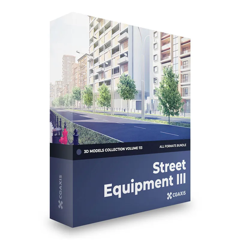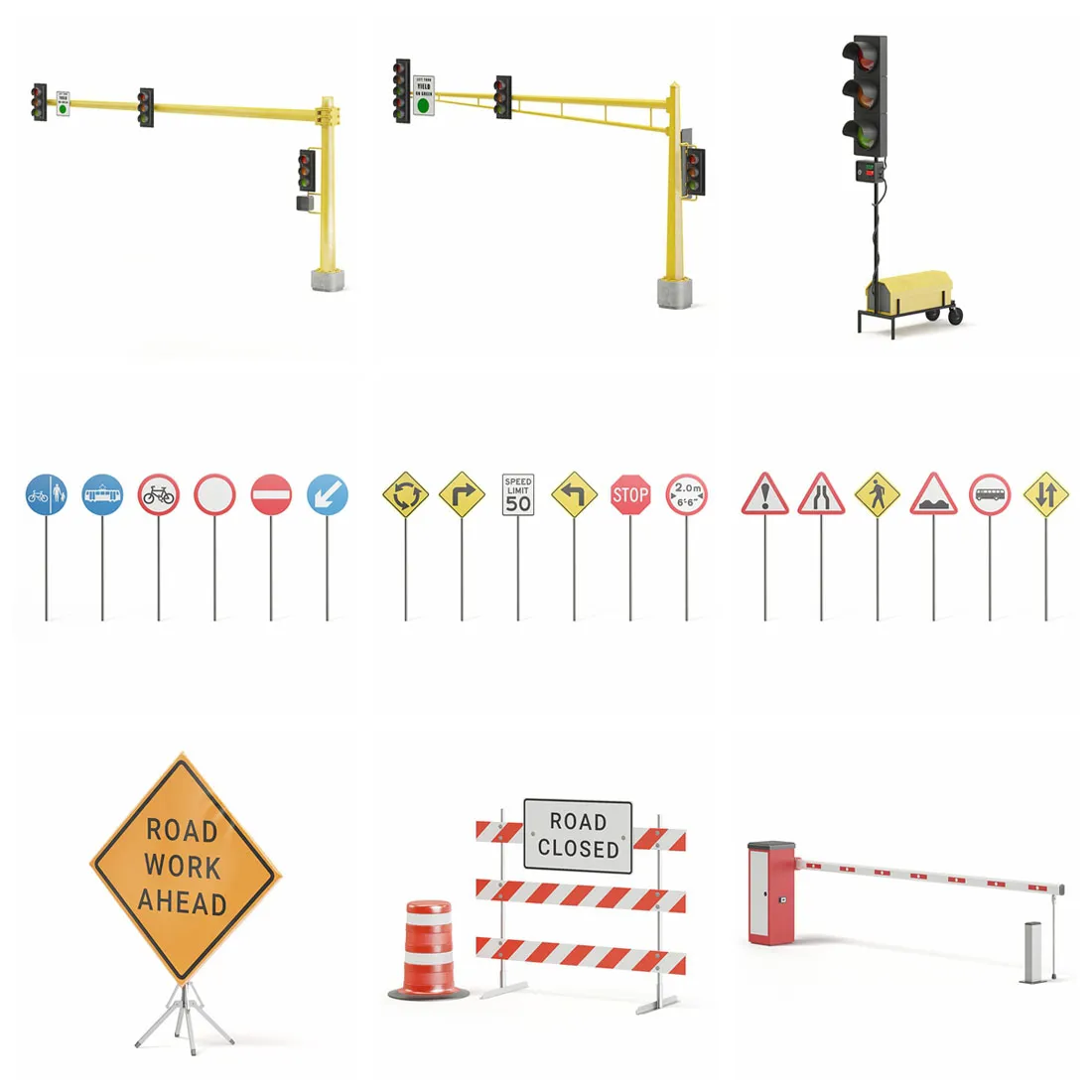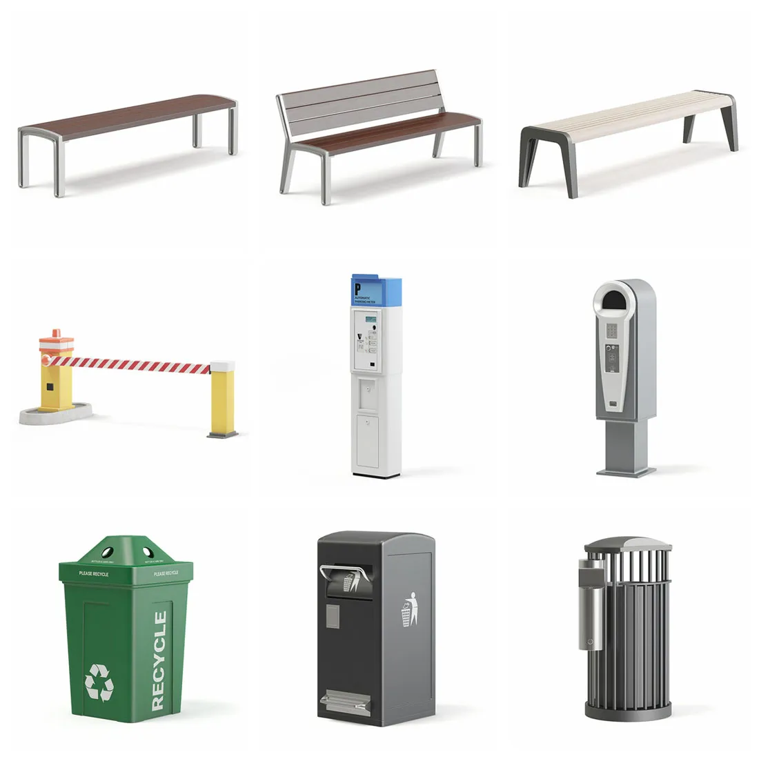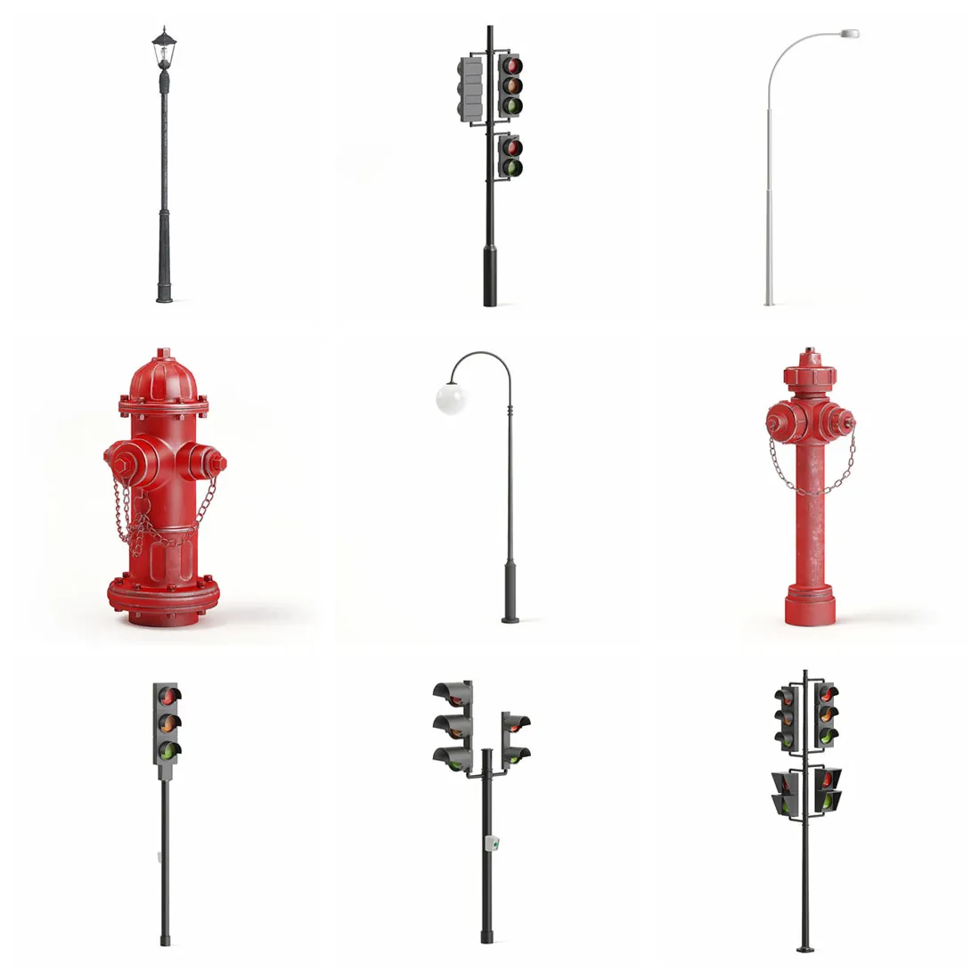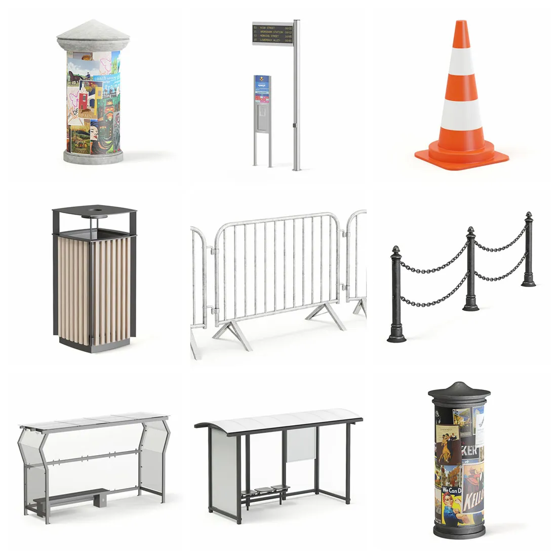 一组40种街头道具和设备的高多边形3D模型。您可以在这里找到路灯和交通信号灯,交通标志,公交车站,长凳,垃圾桶等等。