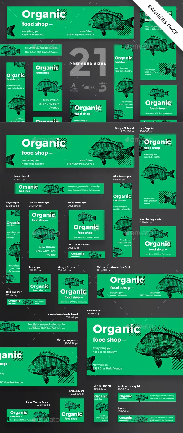 用完美的横幅包装脱颖而出。大量的横幅 - 21种不同的形式和大小,以改善您的网站,社交媒体页面以及博客或移动应用程序的外观,并吸引更多的点击您的帖子。