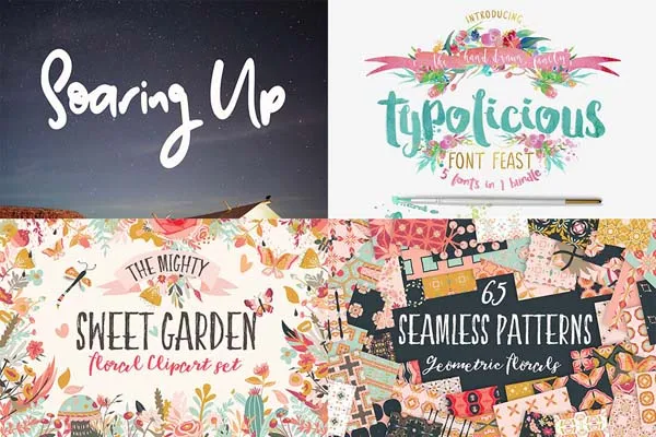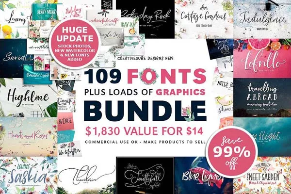 这是一个令人难以置信的素材包,如果你是一名设计师,请准备收下这份大礼包吧。这个庞大的设计包不仅拥有109个强大的字体系列,而且您还可以获得近2000个有用的图形,从水彩纹理到手绘插图。使用扩展许可证,您可以根据需要随意混合和匹配这些字体和图形,用于个人或商业产品。