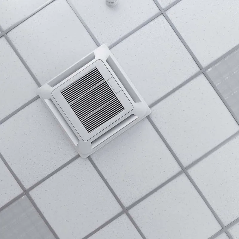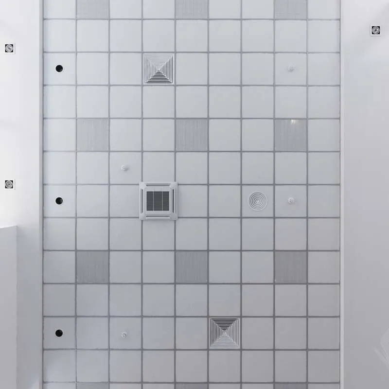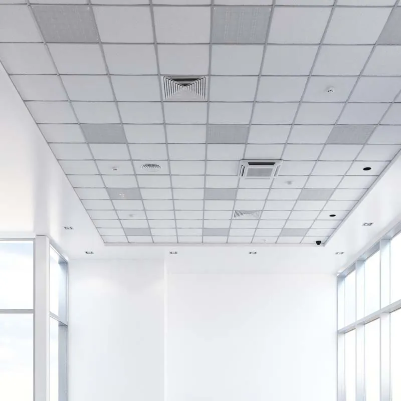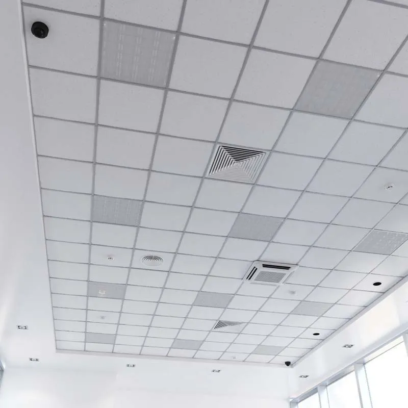 描述详细的天花板与一组元素:照明,传感器,摄像头和空调